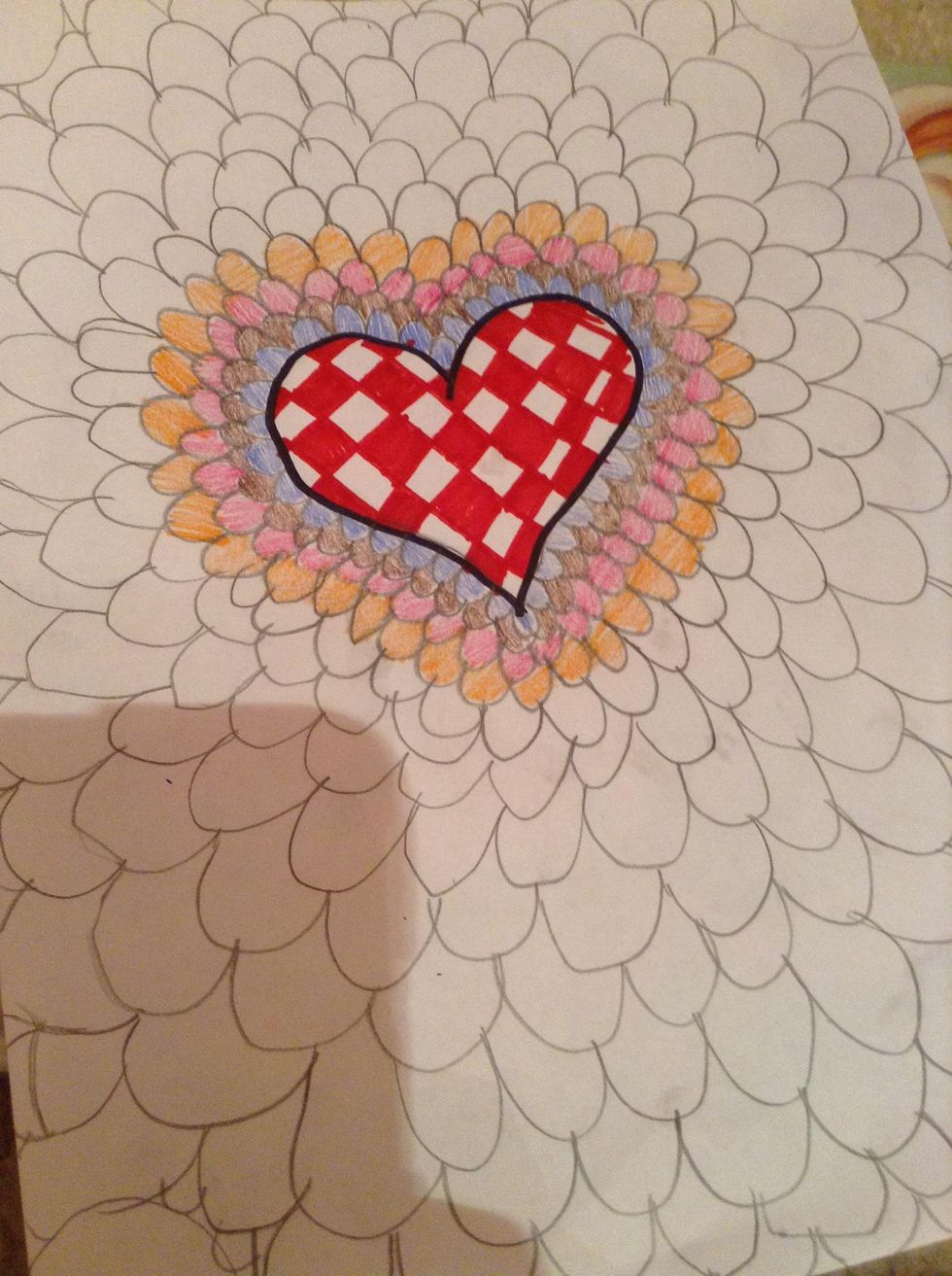 Then with ur pencil draw a medium size heartThen with ur sharpie u out line the heartThen u have to make these little loops around the heartThen once ur done u can make it color full