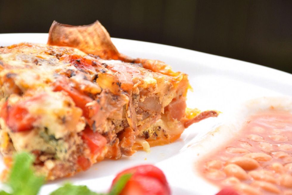 Top with the potato, onion and red sweet pepper mixture.