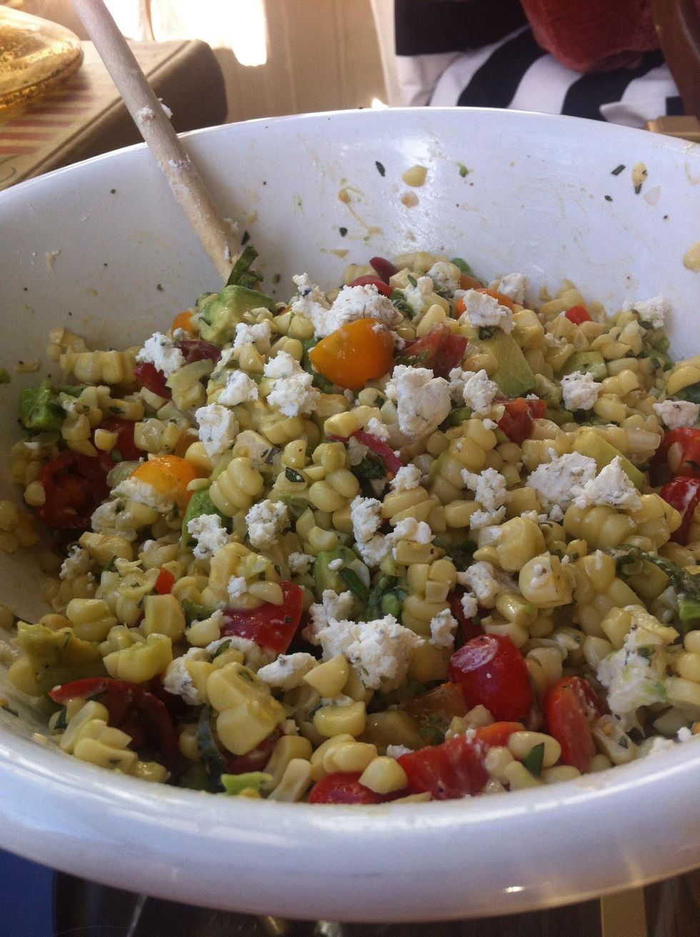 get out that delicious goat cheese, set it aside and put the rest of your ingredients into the large bowl with the corn (you know the tomatoes, oil, s&p, herbs, and onion)