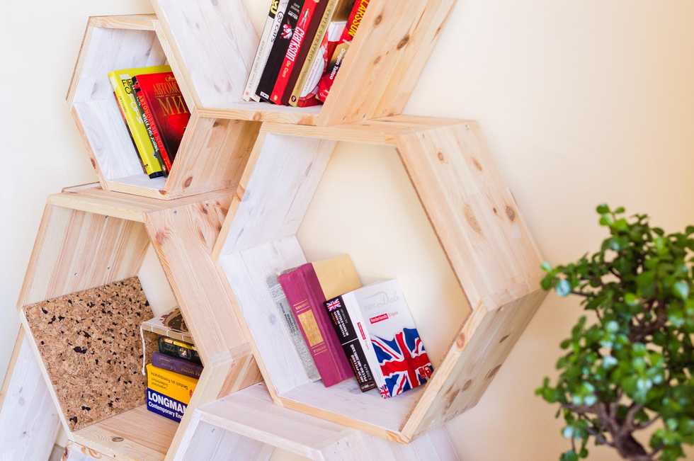 Furthermore, we have painted some hexagons (mostly inside) to add a little bit sophisticated touch to our shelf