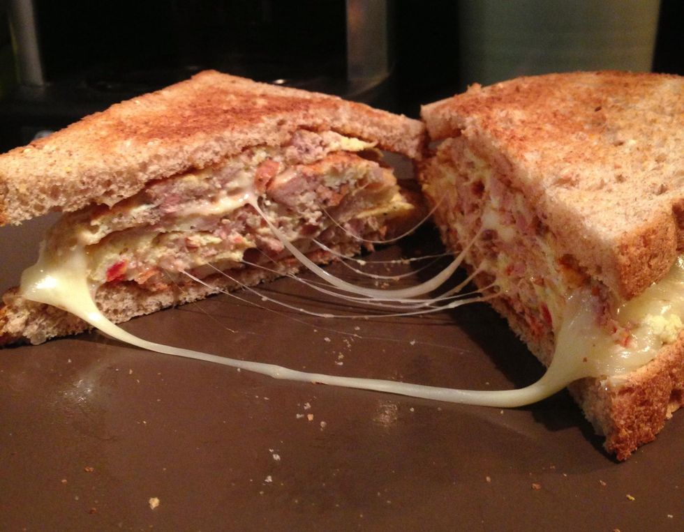 Press the sandwich together, cut it in half diagonally, pull apart and voila! Delicious! Enjoy