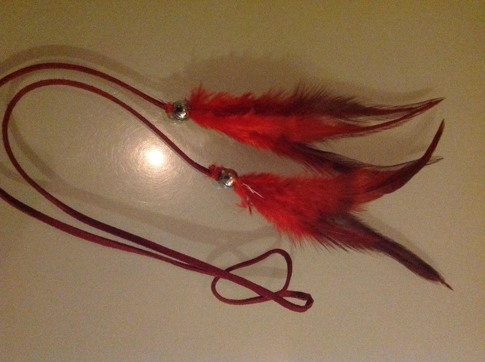 Take your flat cord, I chose red. Cut it to your desired length. Wrap it around your forehead and let a little hang. Approx 25-28 inches.