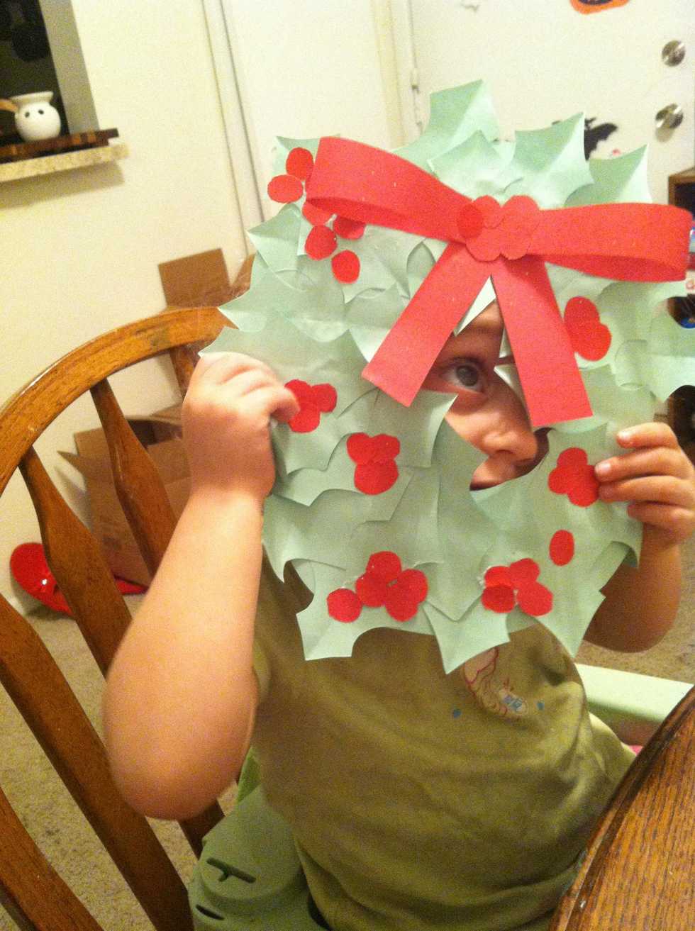 If you're going to do this with more than one kid, cut your paper in advance. Try different shaped leaves and different size berries as well as different shades of red and green.