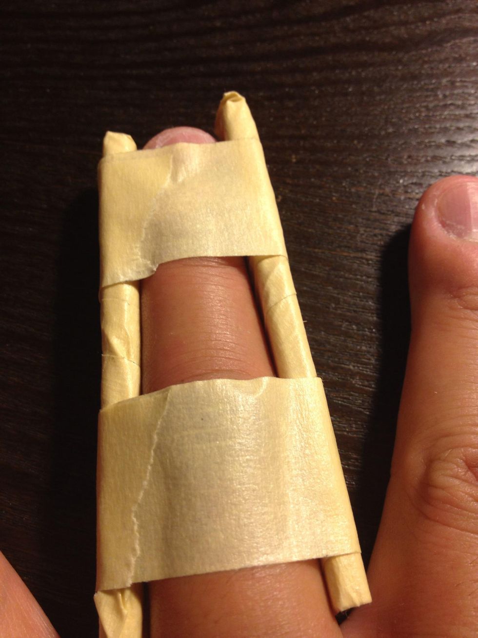 Position the 2 pieces on each side of the injured finger and wrap a piece of masking tape around it. Don't wrap it too tight, just enough to keep the finger straight.
