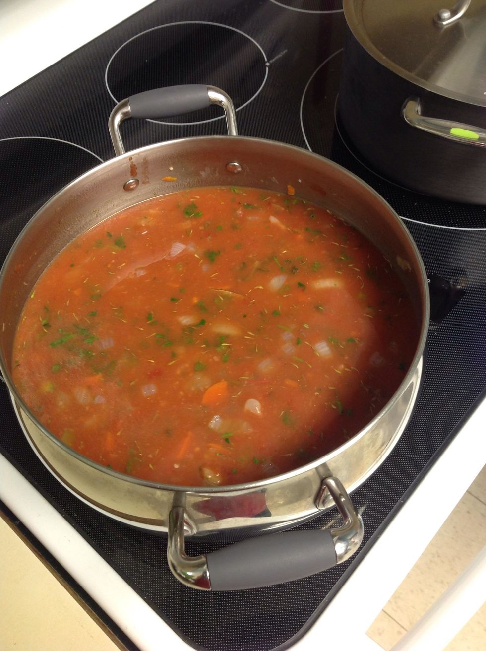 Add remaining ingredients and simmer soup for an hour and a half. The last 10 minutes add shell pasta to finish soup.