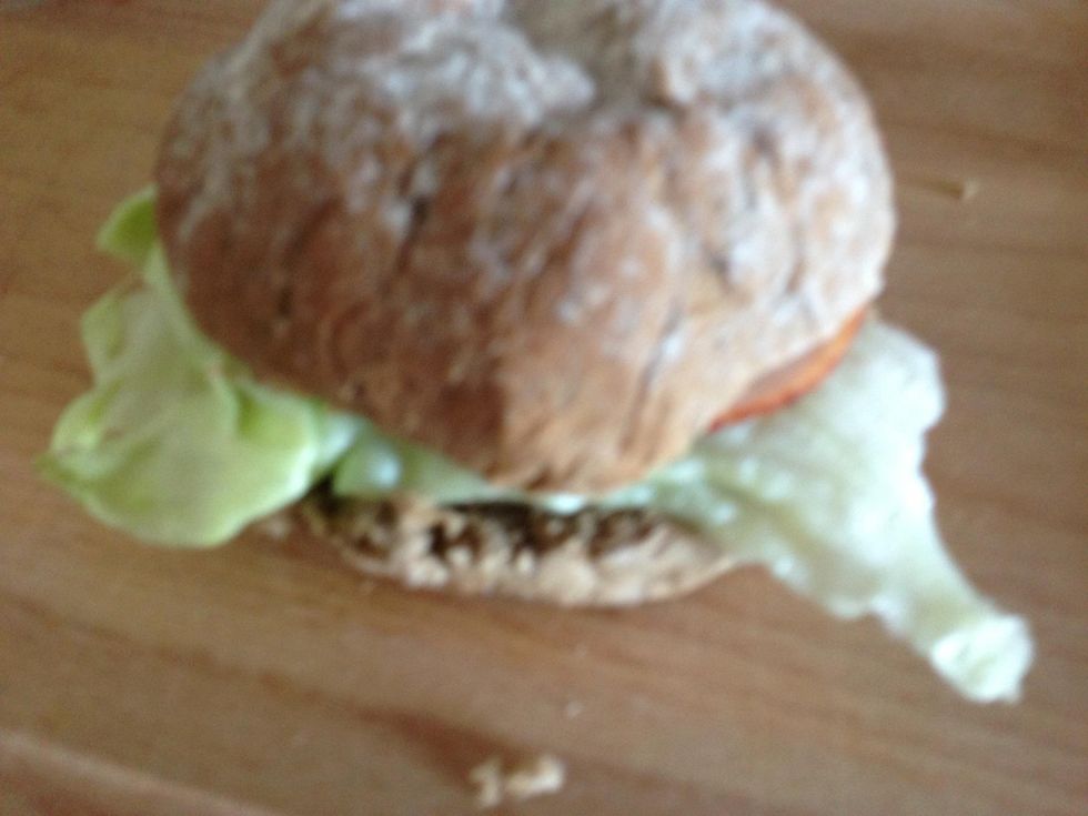 Take a knife, salad, chiken and bread.1) Wash the salad.2) Dry the salad, whit papper.3) Dry.4) Cut the bread.5) Put the salad on.6) Take the chiken.7) Put the chiken on.8) Finish a good sandwish.