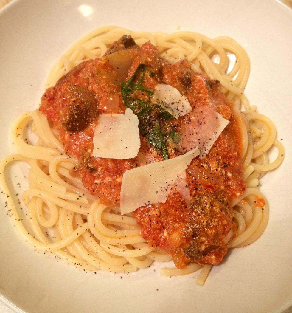 Add your delicious sauce, shaved Parmesan, and some black pepper.
