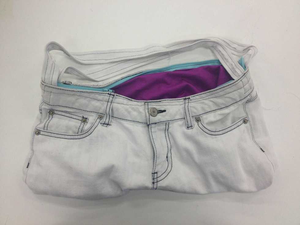 Cut off the pant legs level with the beginning of the legs. Cut at least 2cm below the bottoms of the back pockets and below the zipper, for seam allowance.
