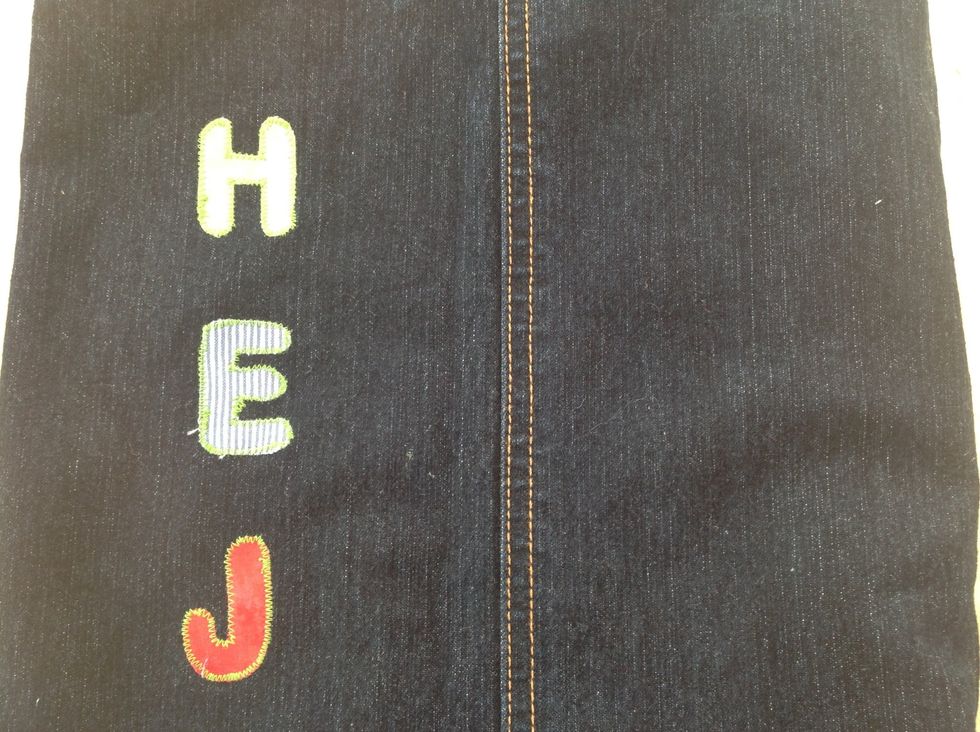Klipp till två remsor från byxornas framsida, ca 8 cm breda och 40 cm långa.