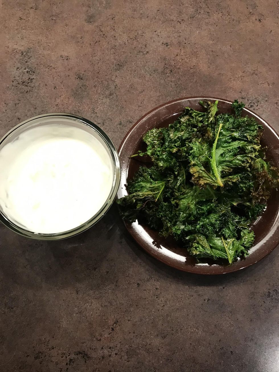 Enjoy the kale with the lemon yogurt dipping sauce.