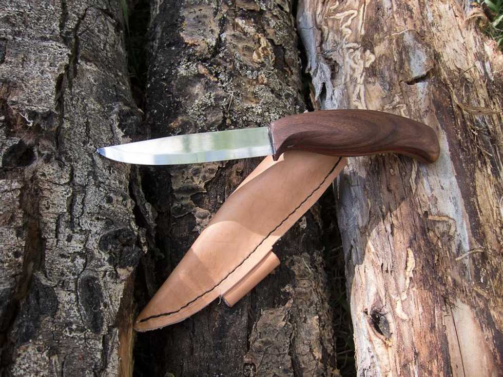 Shape the rough handle using a power sander, rasp, etc. I used a spindle sander and finished by hand sanding. Then coat the blade tang with epoxy and pop it into the handle.