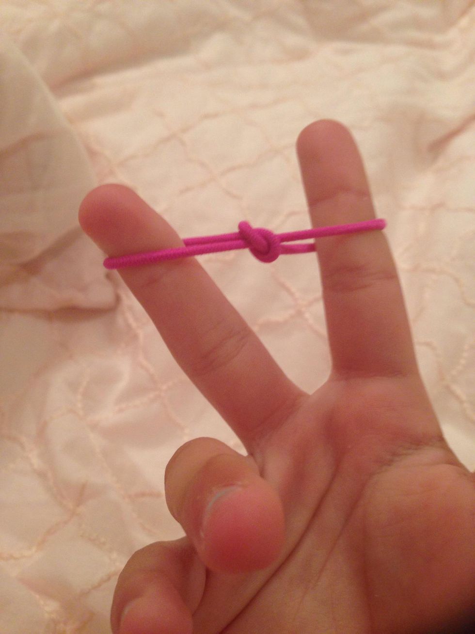 Then place your pointer finger through the rubber band and put your middle finger into the thumb hole and take your thumb out