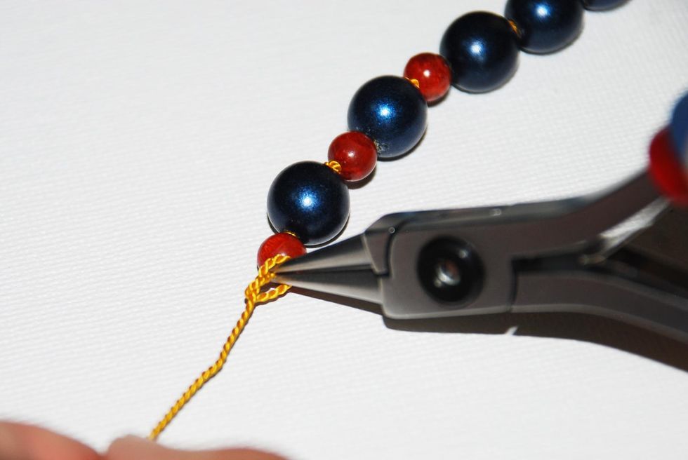 Continue to hold the thread with your round nose pliers, while you pull the long end of the thread to tighten the knot over the tip of the pliers.