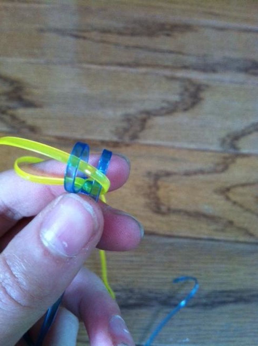 Still holding on to the loops carefully thread the yellow lanyard over the first blue loop and under the second one.