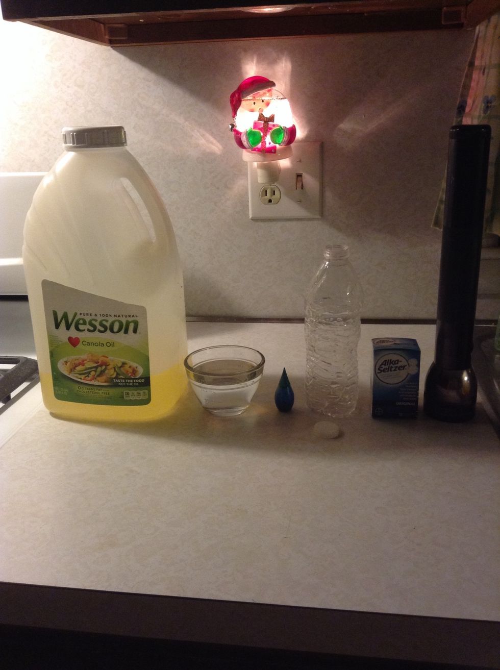 First, you will need to lay out materials. Take out canola oil, water, dye, alkaseltzer, and a water bottle.