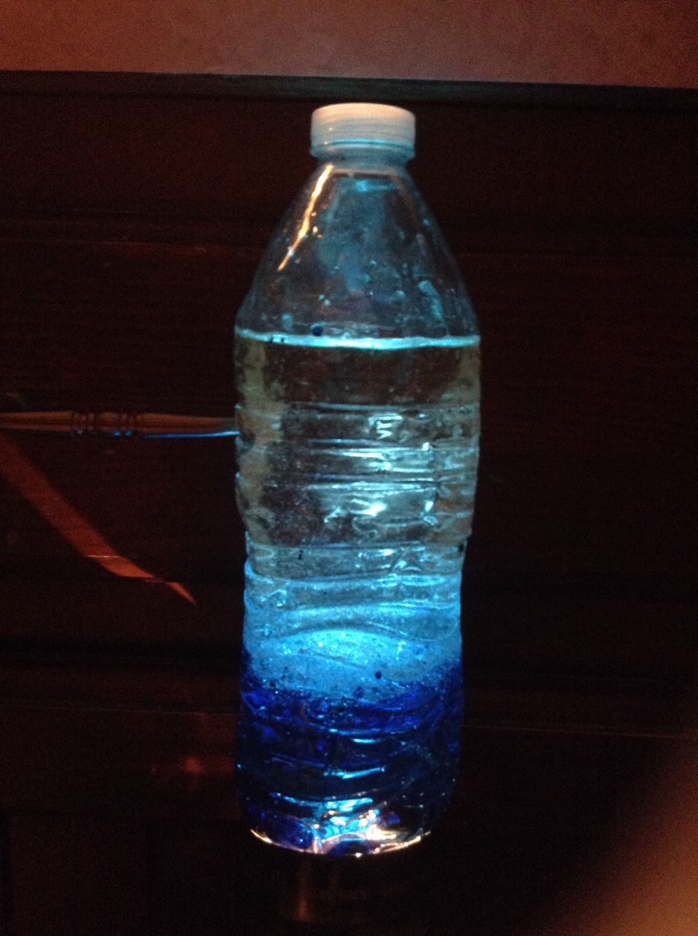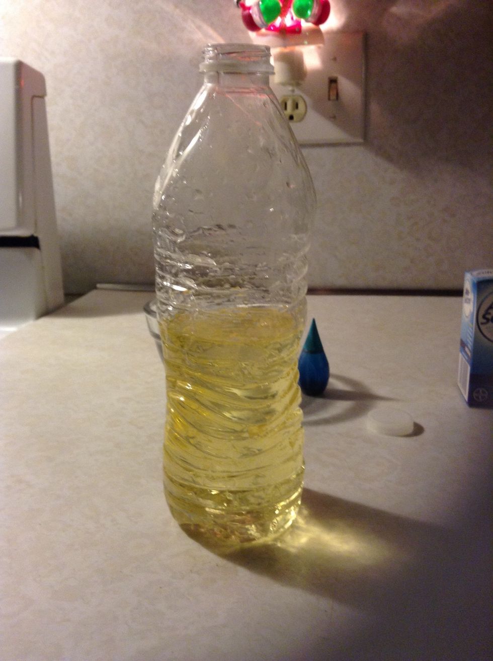 Third, fill a quarter of the water bottle with water. Due to the density, the water will drop to the bottom. Let it settle before continuing to the next step.