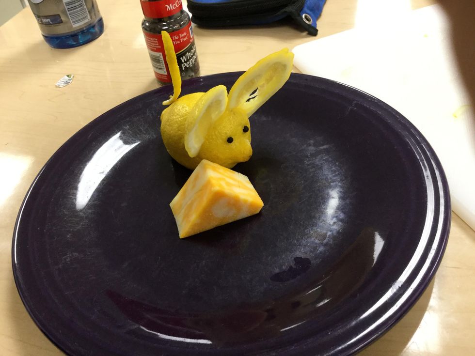 Cut a small slit in the end of the lemon and place a peppercorn inside it. Do it twice for both eyes.