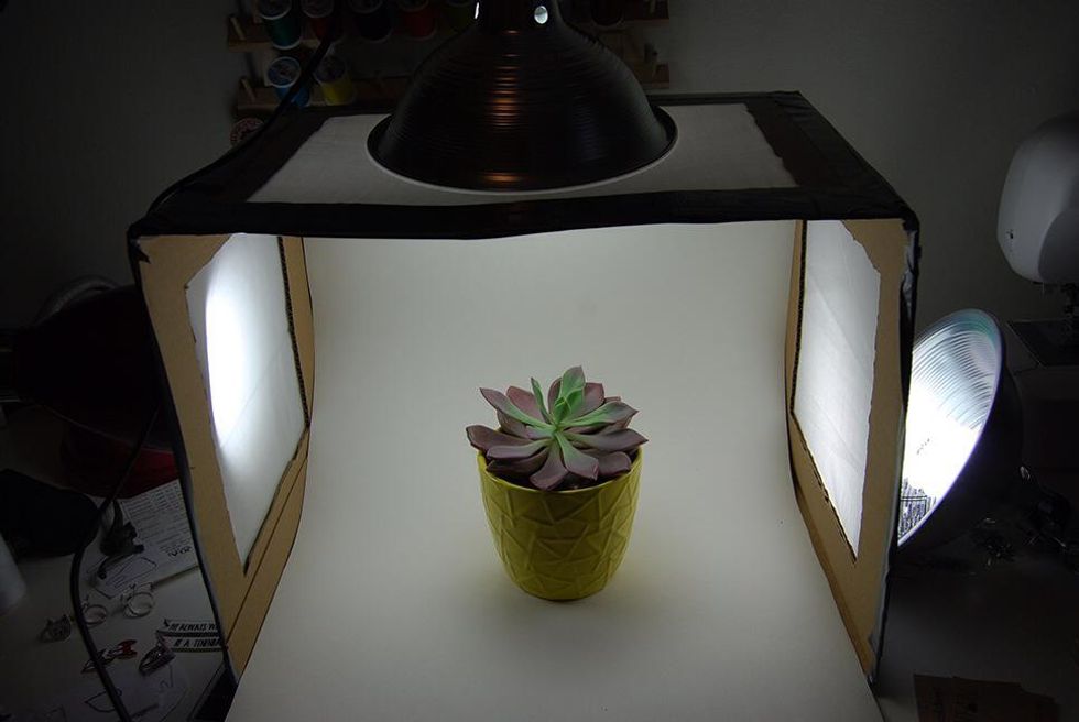 Place a lamp on each side and one on top. And you are finished. The lamps and the bulbs are from Home Depot, as well as the box. Each lamp was $8 and the lights were 4 for $5. The box was around $1.
