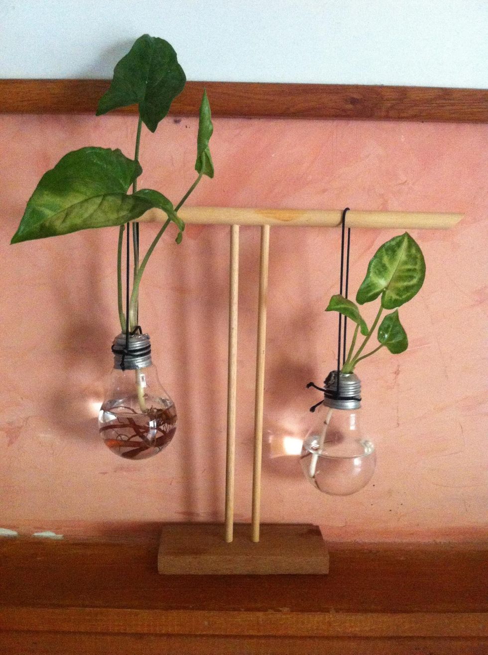 and then empty the light from inside by the pin push. be careful from the glass,tie the sting into the top of the light,And then add water and put flowers or anything u like.