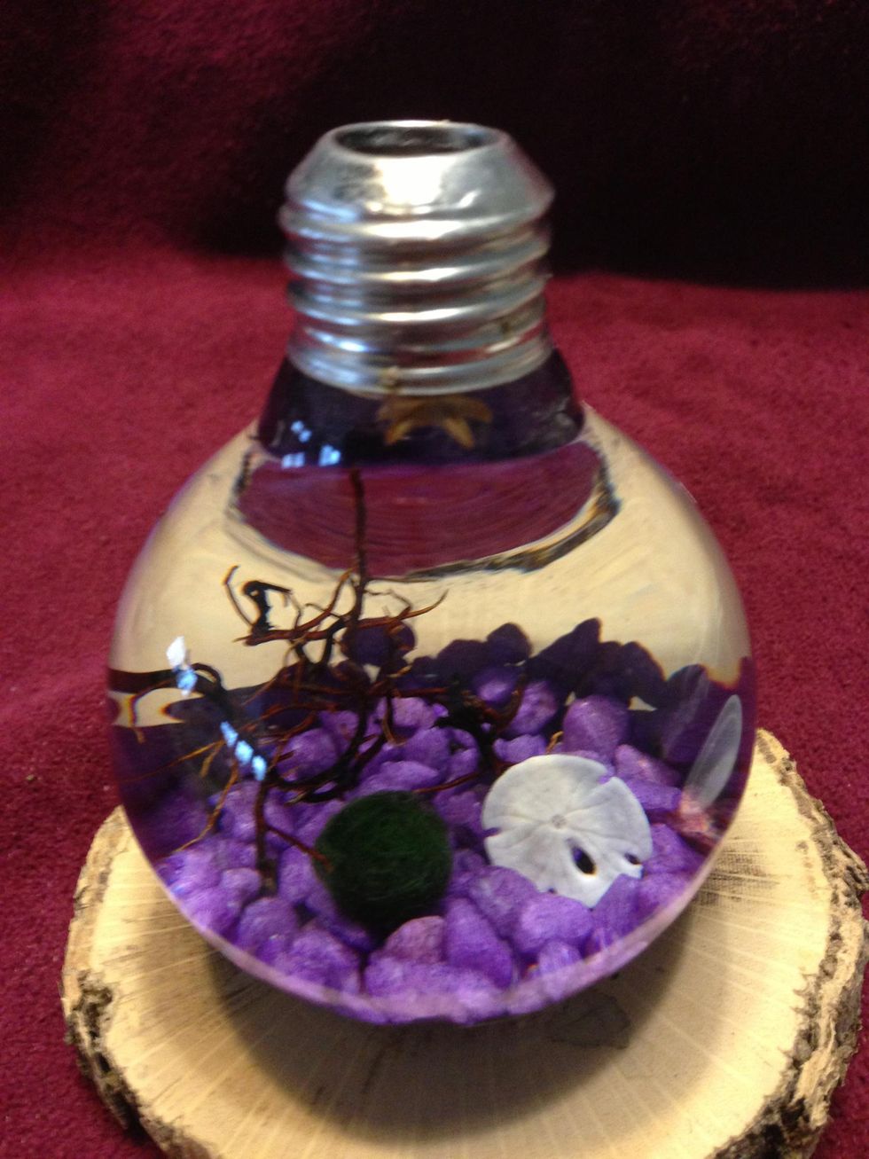 Supplies: Any light bulb will do. If not clear, swish gravel around inside with water to remove coating after removing interior parts. Live Marimo miss balls make a great occupant.