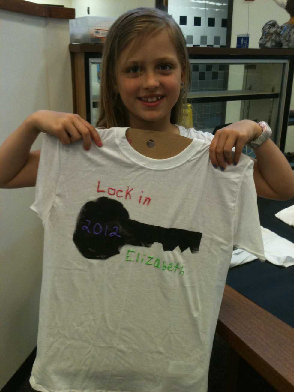 Be sure to not squeeze the paint too hard. Under the key write your name and in the big part of the key put the year. On top of the key put "LOCK IN".