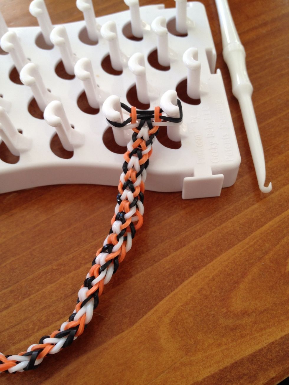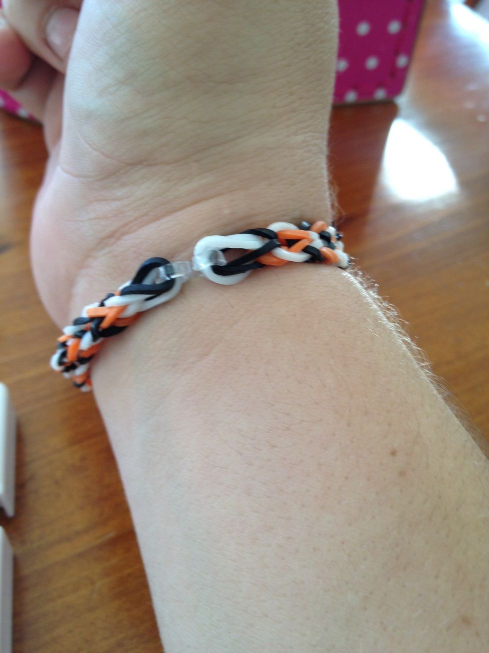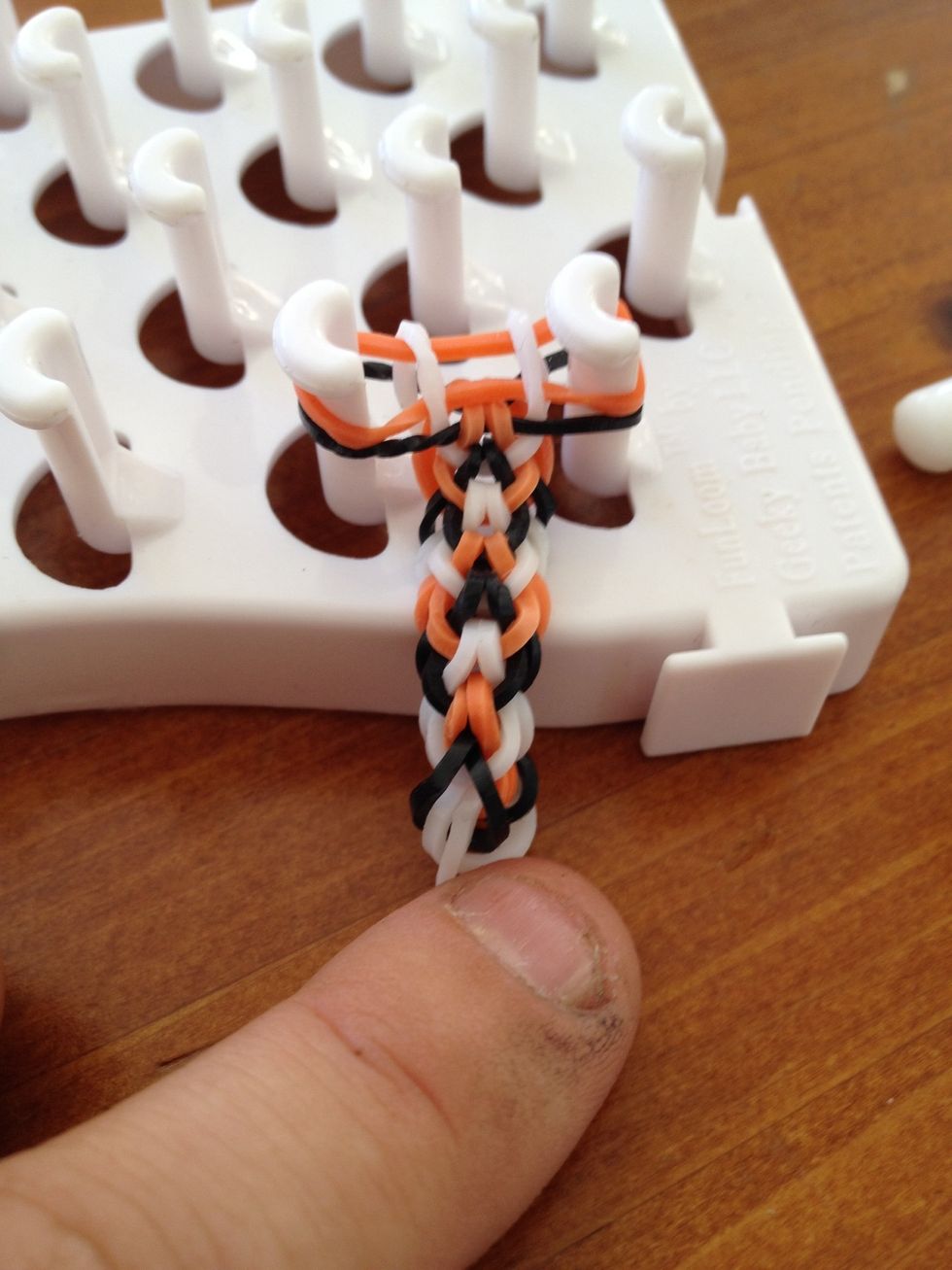 When you have reached desired length hook the two bands of each pin with your loom hook and attack your a clip to both ends