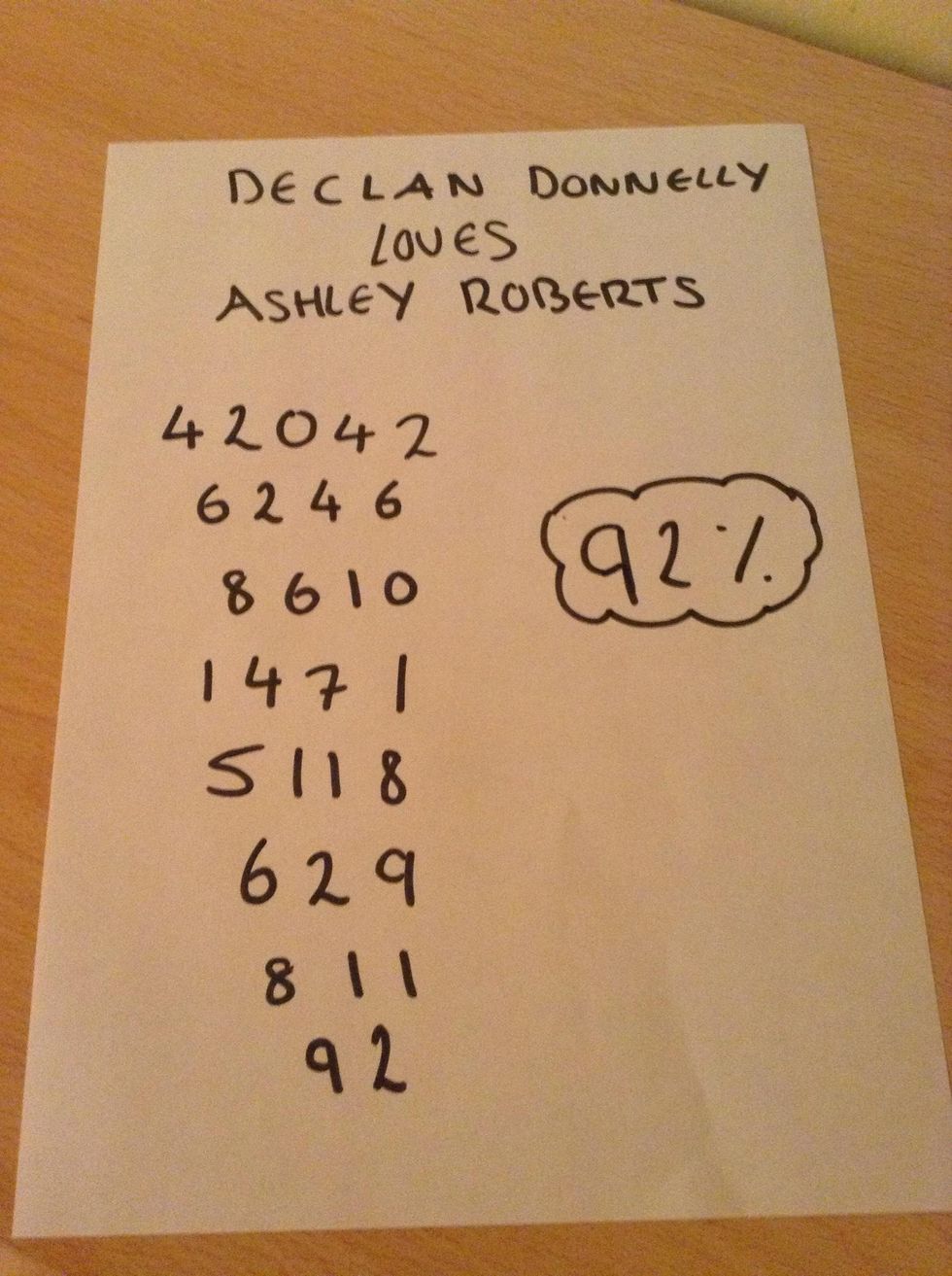 So, Declan Donnelly loves Ashley Roberts 92%. If you are not happy with the results add middle names or nicknames.