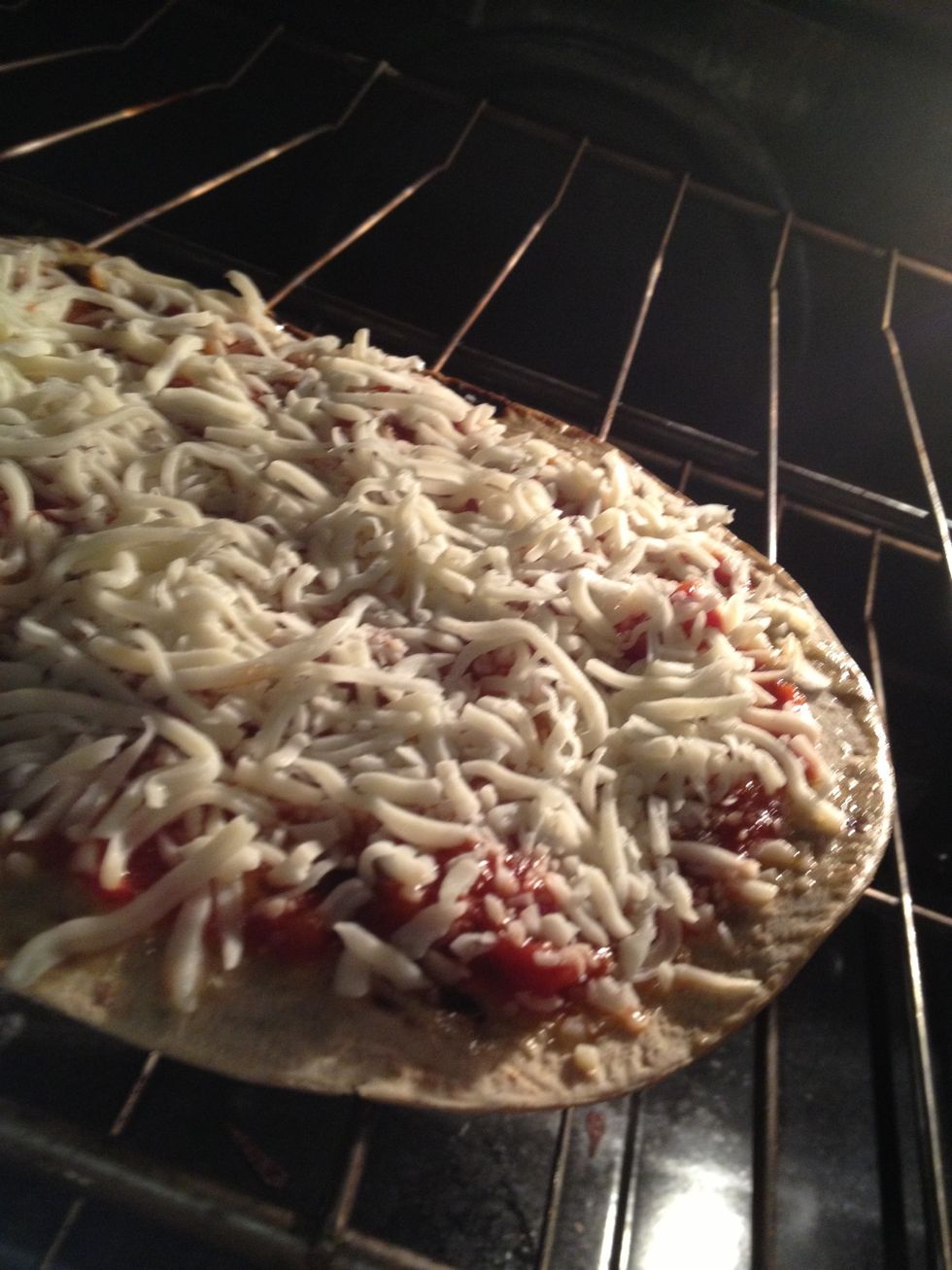Sprinkle on a cup of mozzarella cheese. Don't forget, you can also add toppings like chicken, tomato, onions, hamburger, pepperoni, or whatever you'd like. I just don't have that stuff right now.