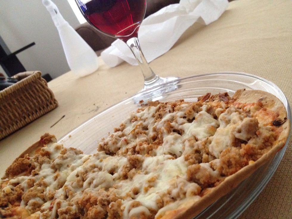 Spread sauce onto the flatbread. My wife likes to rub a garlic clove over the flatbread, instead of sauce. Spread within about a half inch from the edge of the flatbread so you have a little crust.