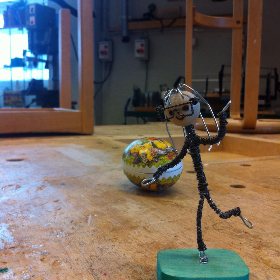 Böj till fötterna och fäst figuren på en träbit med skruv.