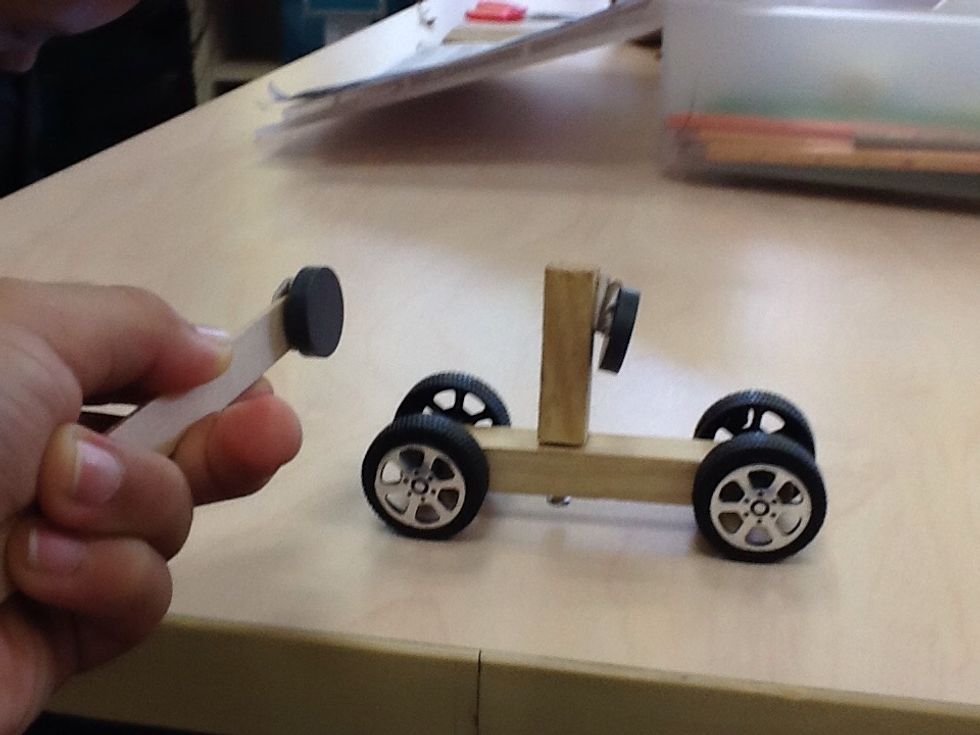 Next,stuck the shorter piece of wood on the nail,use dubble Side tape to stick the magnet on the shorter piece of wood.
