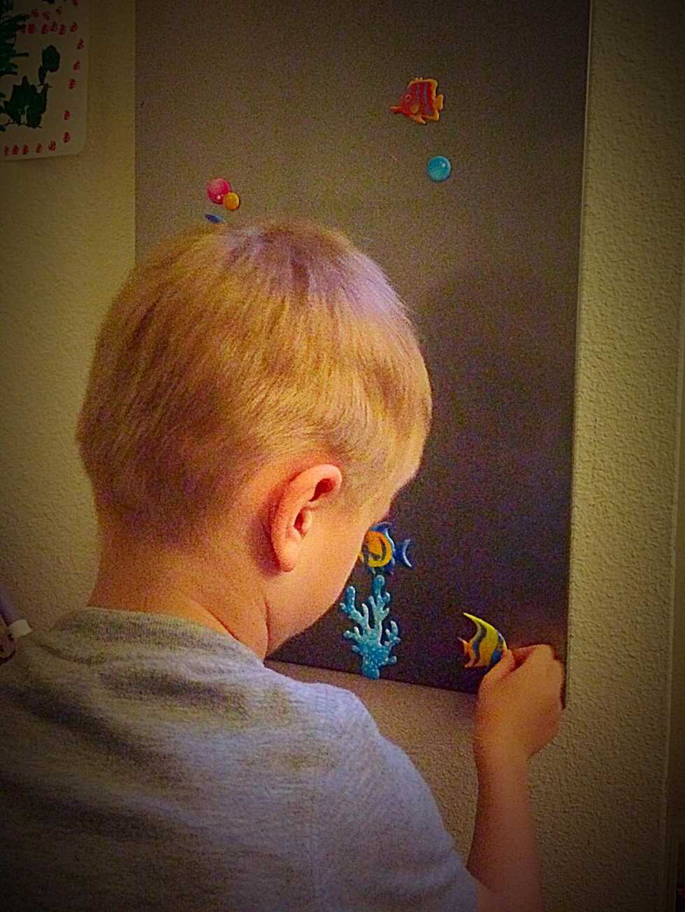 Let your kiddos create scenes and tell stories using the magnets on a metal surface. I've seen pie pans and small baking sheets used for travel versions. This pic is of a small magnet board from Ikea.