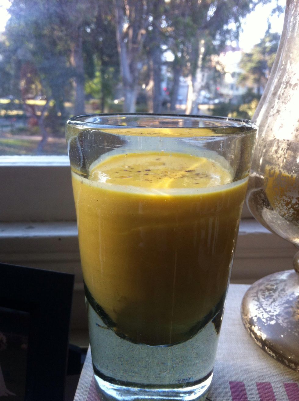 pour it through a fine mesh strainer, to keep those weird bits of mango string and whatever else clogging my strainer. it goes very slow. be patient (or use your fingers to help it through like I did)