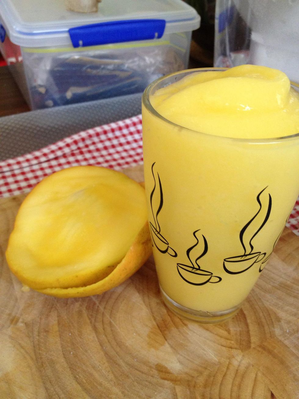 ripe mango, scoop flesh out into blenderice cubessugar, 2-3 tbspplace ingredients in a blender, add just enough water so the blender blades are able to mix ingredientsblend until ice is smoothserve with your favorite snack