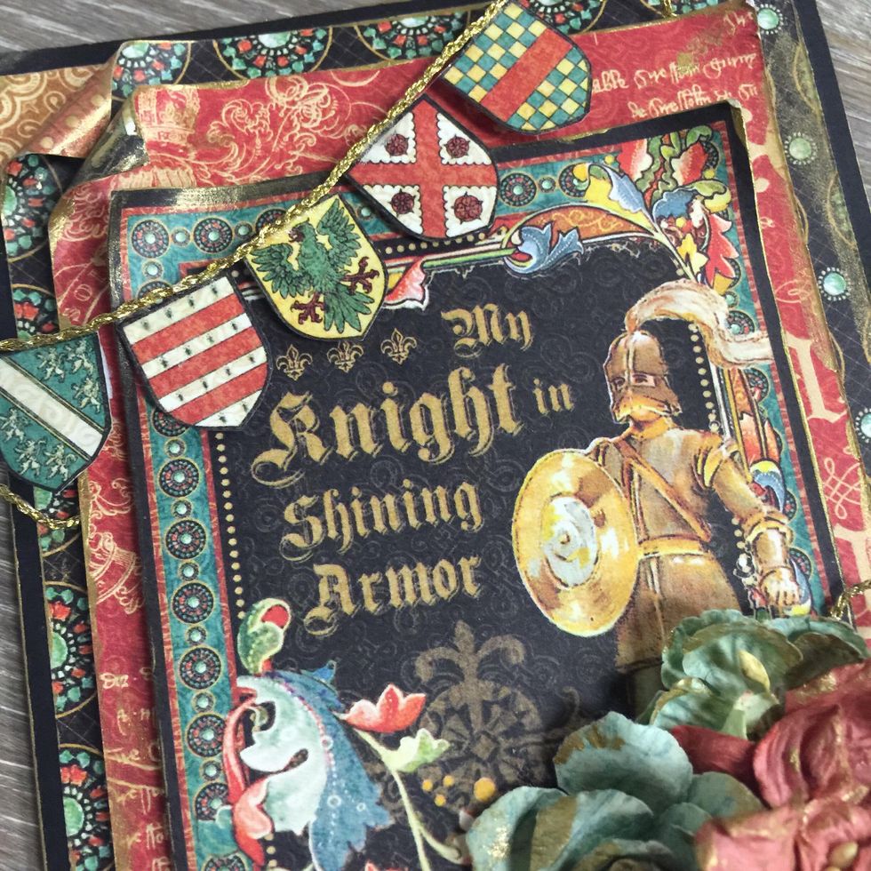 Cut out Knight in Shining Armor 3x4 cut out from Gallant Knight sheet. Later in center of card with foam adhesive. Curl all corner slightly up to create more dimension.