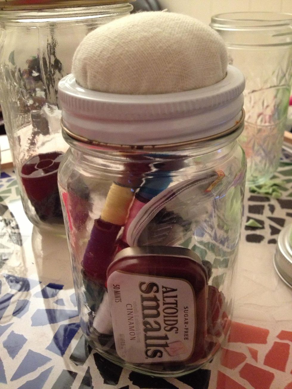 Now fill your mason jar with sewing essentials (needles, pins and safety pins, buttons, small scissors etc.). Along with the small spools of colored thread, I'm adding larger spools of black and white