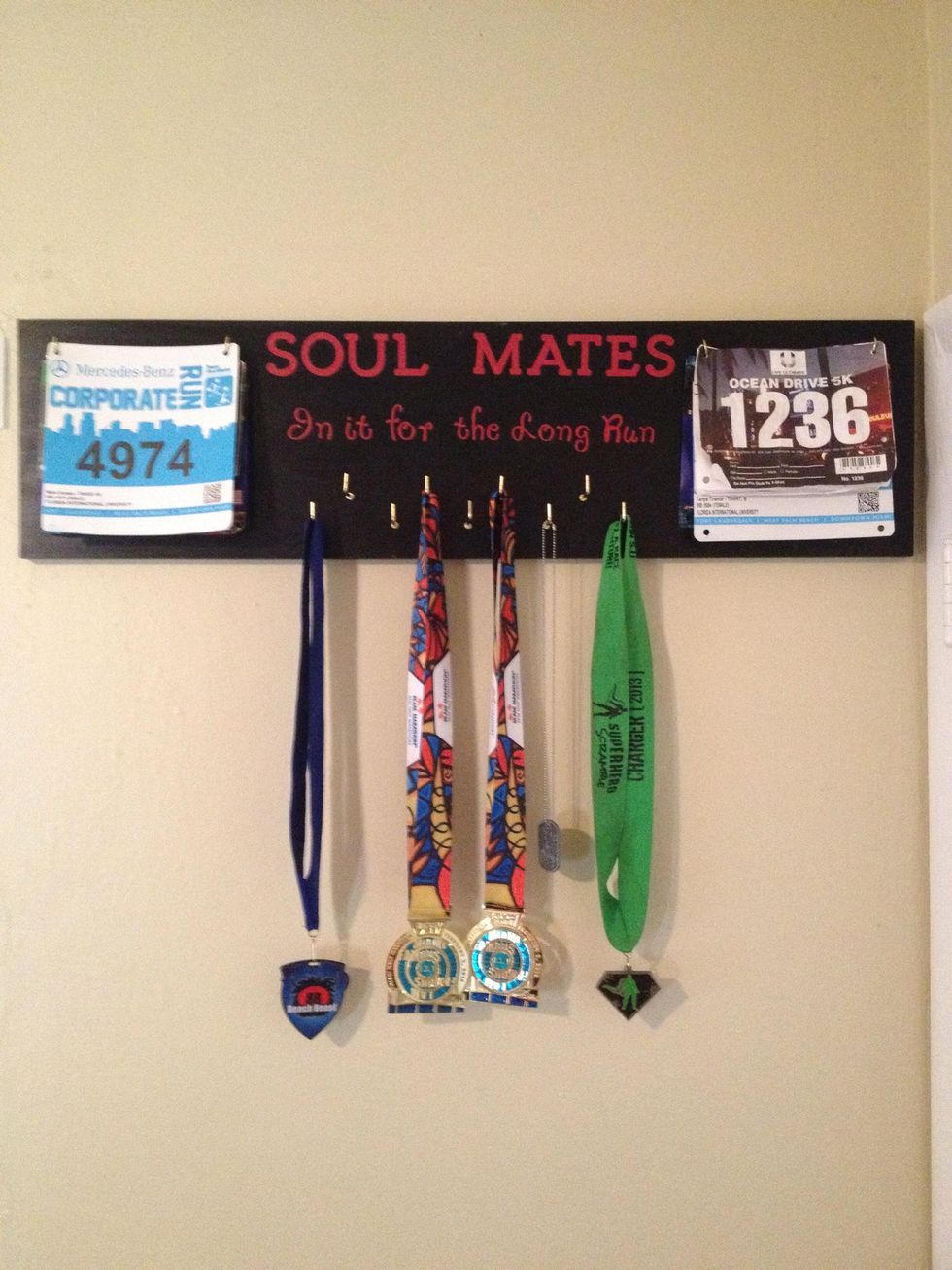 This is a my sketch of where I would be drilling the holes on the wooden board. Top holes to hang the bibs and bottom holes to hang the medals.
