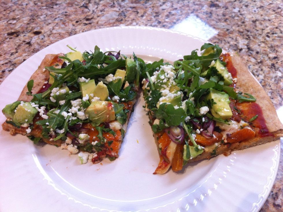 Top pizza with olives, avocado, arugula, parsley, feta cheese and lemon zest. Drizzle with olive oil.