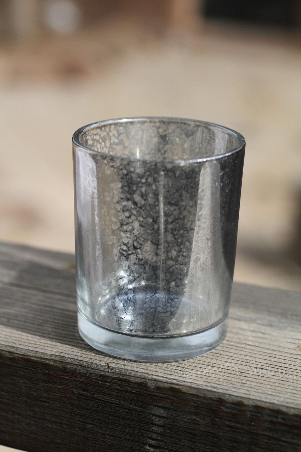 Lightly spray looking glass paint on the inside of your glass, over your vinegar/water droplets.