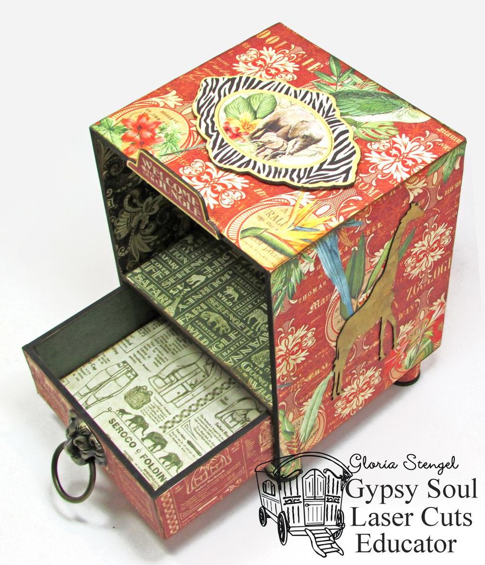 Glue GSLCuts Safari chipboard shapes to the box. Add Graphic 45 decorative chipboard as desired.