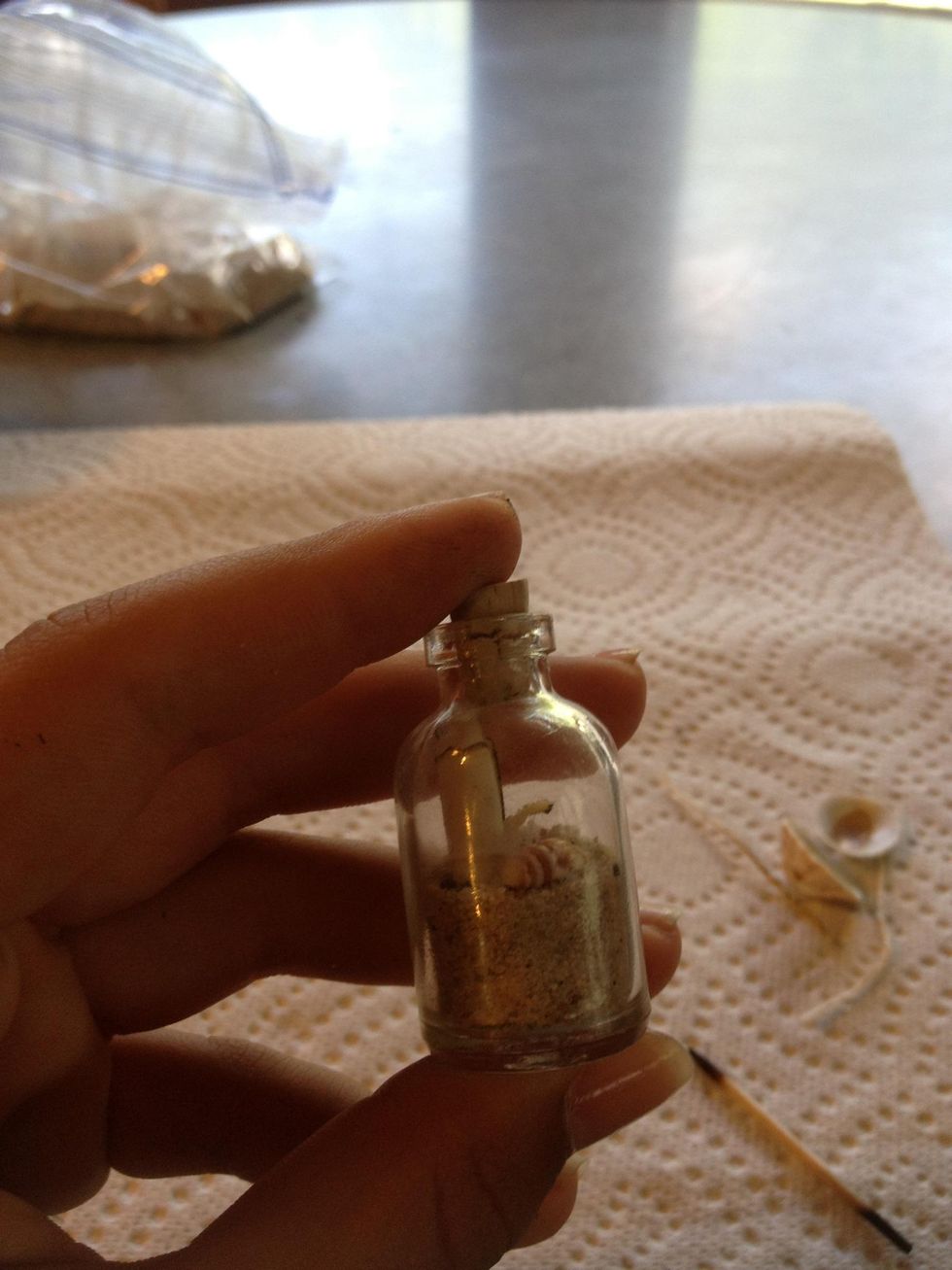 Put everything in the jar (you may need tweezers to push the mini scroll in). I suggest putting shells in first. Cork the bottle, and you're all done!