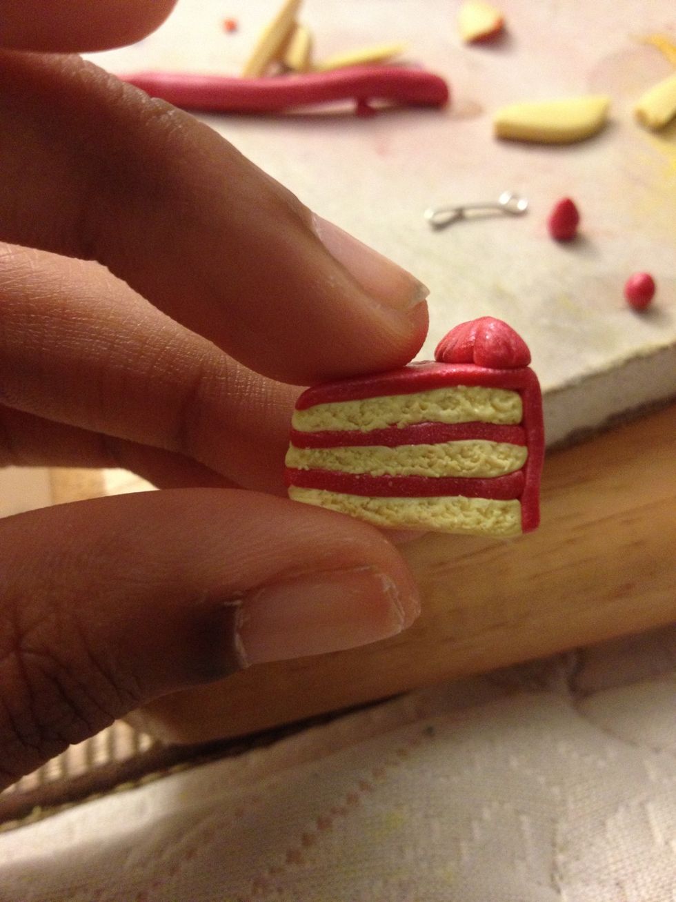 Put the cake slice on top of the icing slice to make sure the icing is the same size as the cake. You'll always need one less slice of icing than cake. So 2 icing triangles with three cake layers.