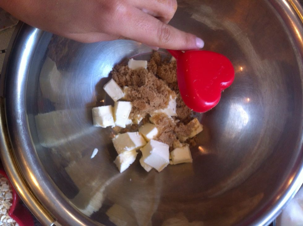 In your bowl of small cubes of butter add 8 tablespoons of brown sugar