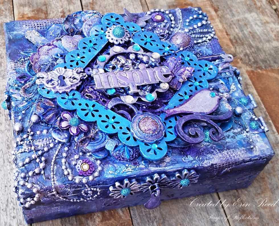 One of the first steps to paint all the items with gesso. Once dry apply them to the box and give everything its first rounds of sprays. I used Tattered Angels in colors of Blue and Purples.