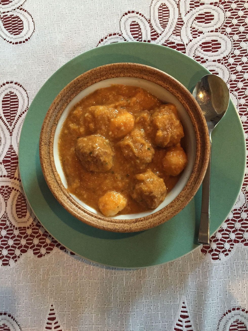 Add the semolina balls to the hot soup. Simmer for about 45 min.