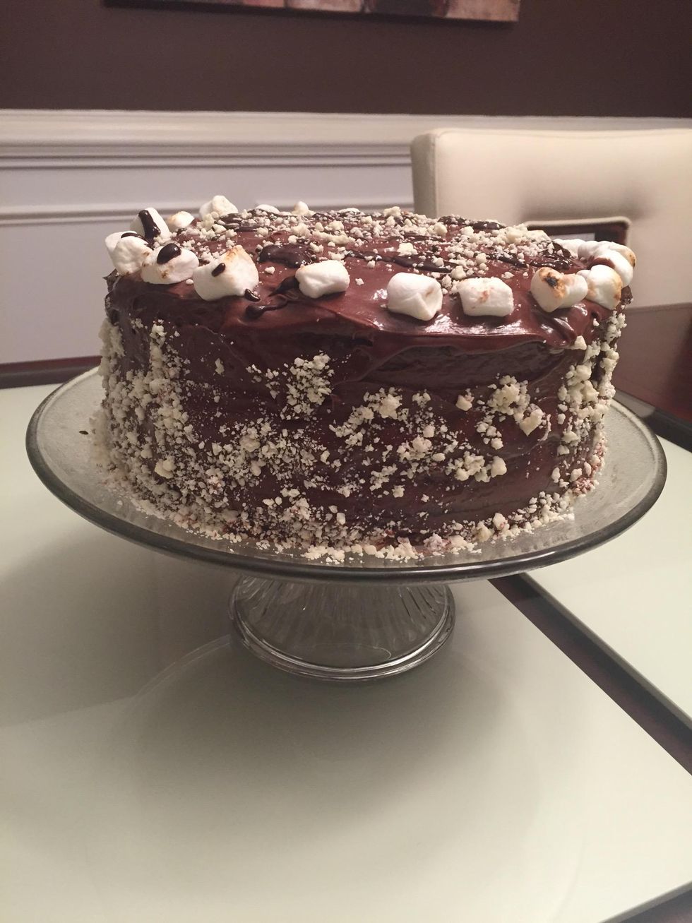 Remove cake from pan and brush on chocolate followed by milk chocolate frosting and marshmallows.