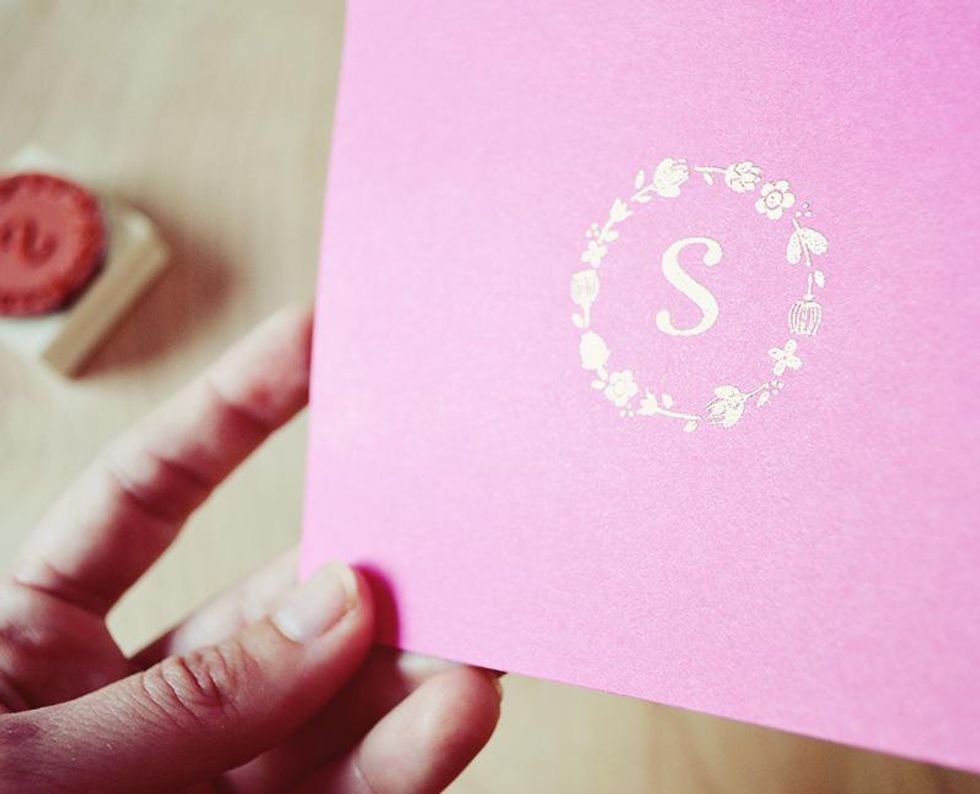 Gently press your stamp onto the note card.