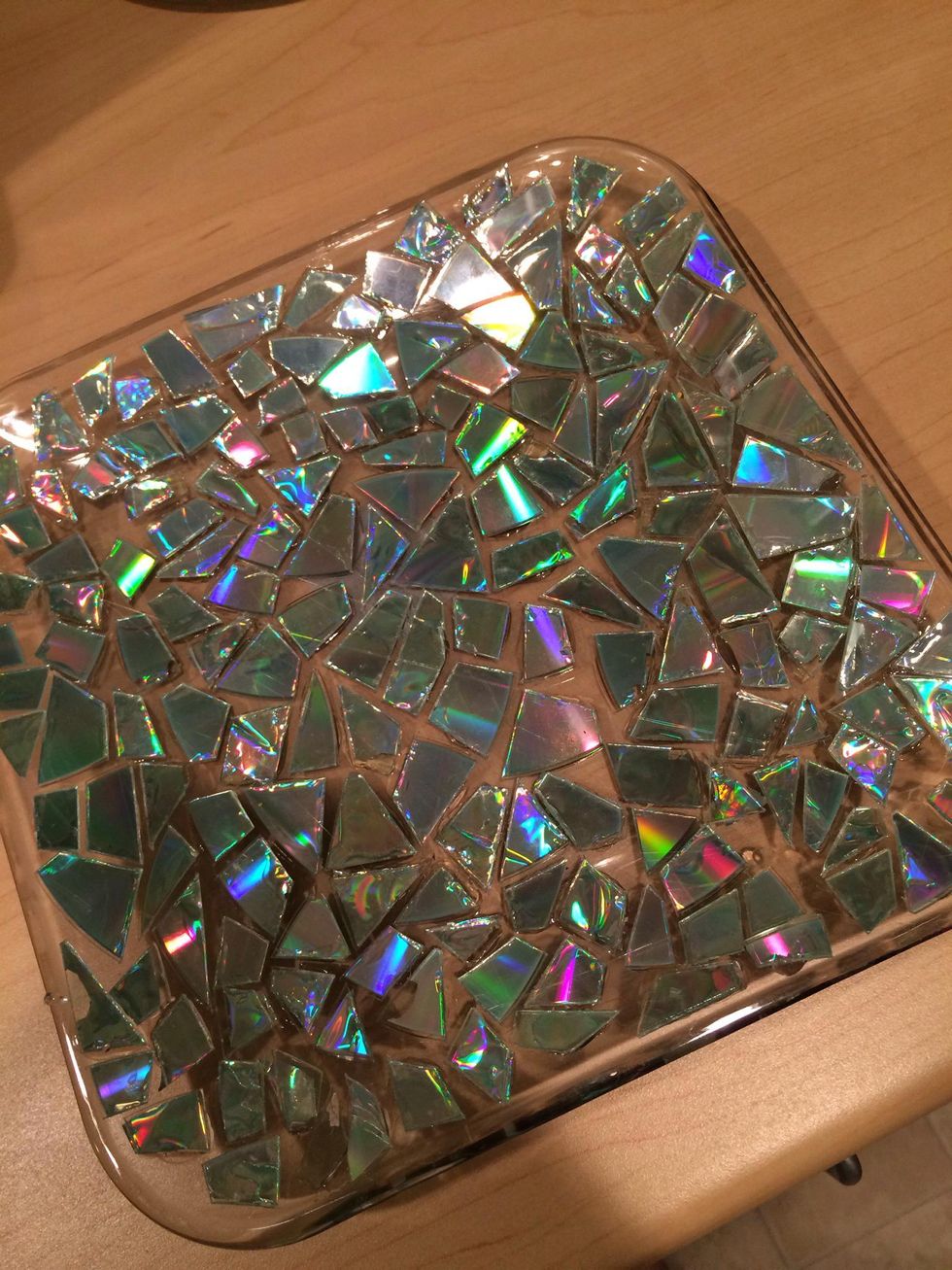 4. Use the E6000 adhesive to glue the CD pieces onto the glass bowl. You should use gloves when doing this because the glue is extremely sticky.