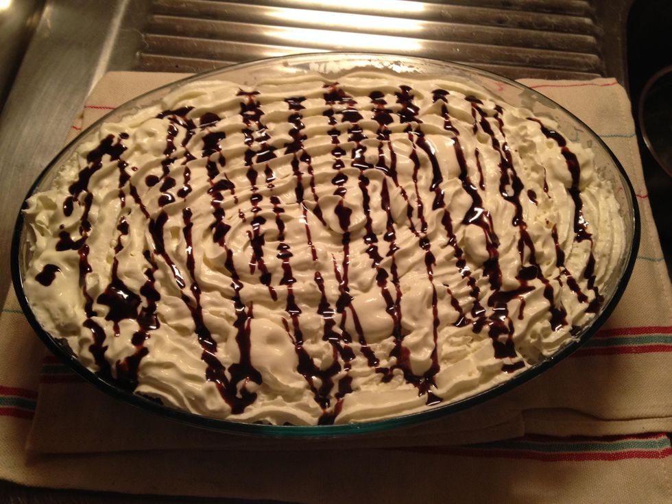 Decorate the cake with the chocolate syrup. If you love Oreo cookies as much as I do, crumble cookies on top of the cake.