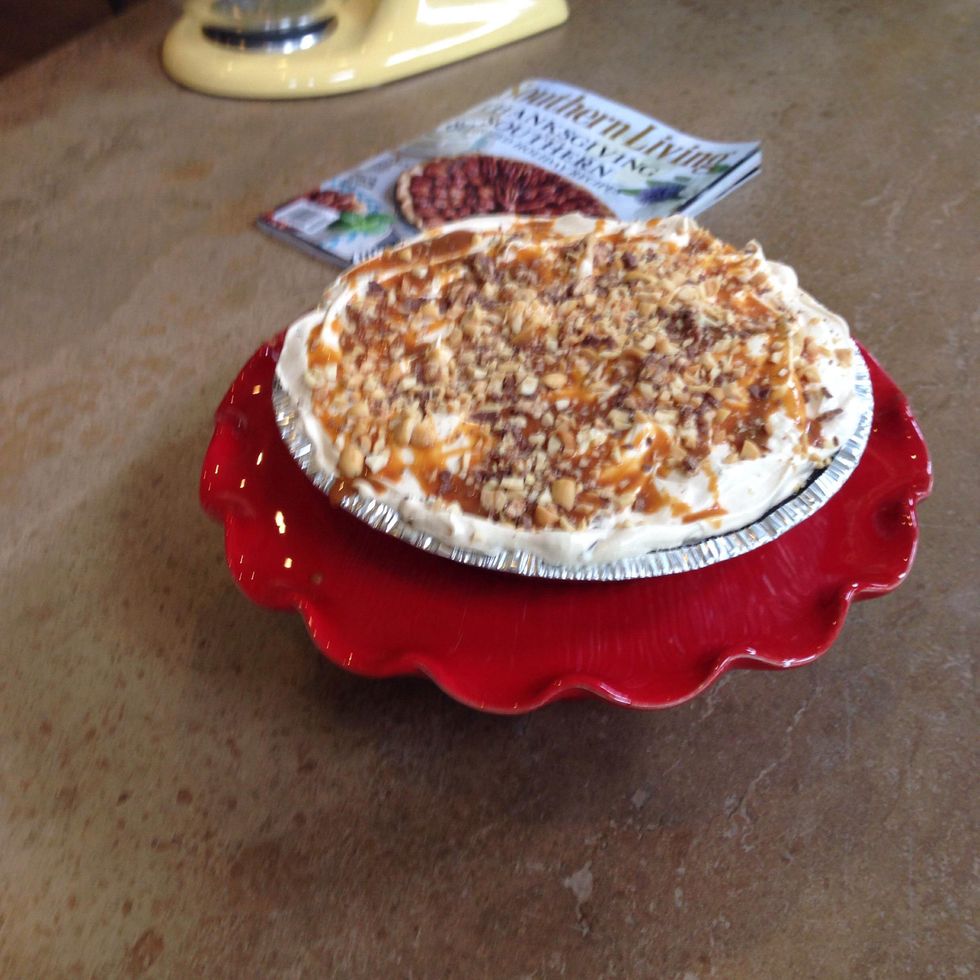 Top with remaining chopped snickers and peanuts. You can also drizzle top of pie with melted chocolate or Hershey's!